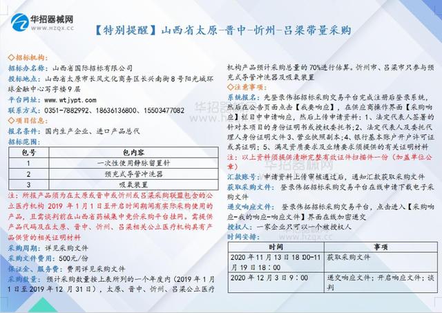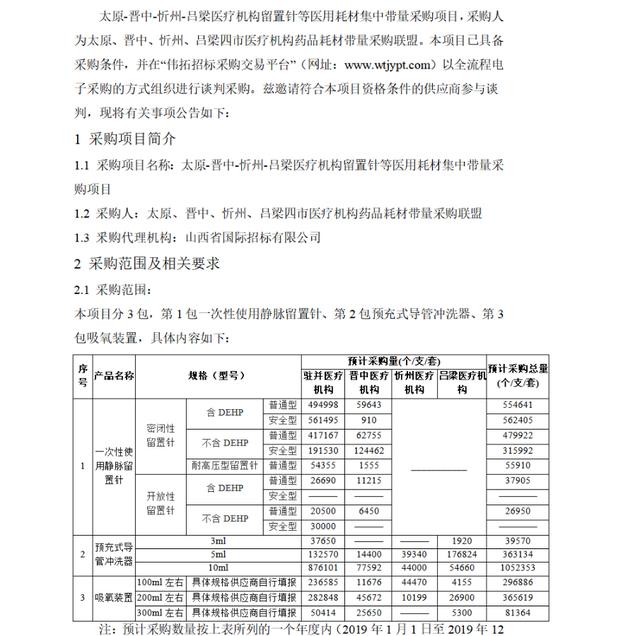 来源:华招器械网 11月13日,山西省太原、晋中、忻州、吕梁四市发布留置针等医用耗材集中带量采购项目谈判公告,本次带量采购品种包括:一次性使用静脉留置针、预充式导管冲洗器、吸氧装置三类。忻州、吕梁市只参与预充式导管冲洗器及吸氧装置。 本次采购周期
