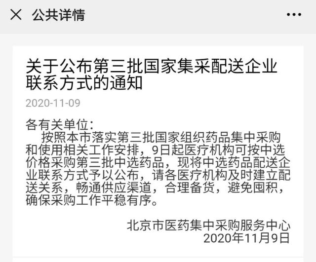 ▍来源/赛柏蓝 ▍作者/半夏 今天开始!北京执行第三批国家集采 今天起,北京执行第三批国采 今日(11月9日),北京市药品阳光采购微平台发布《关于公布第三批国家集采配送企业联系方式的通知》。 通知明确,从11月9日起北京市医疗机构可按中选价格采购第三批