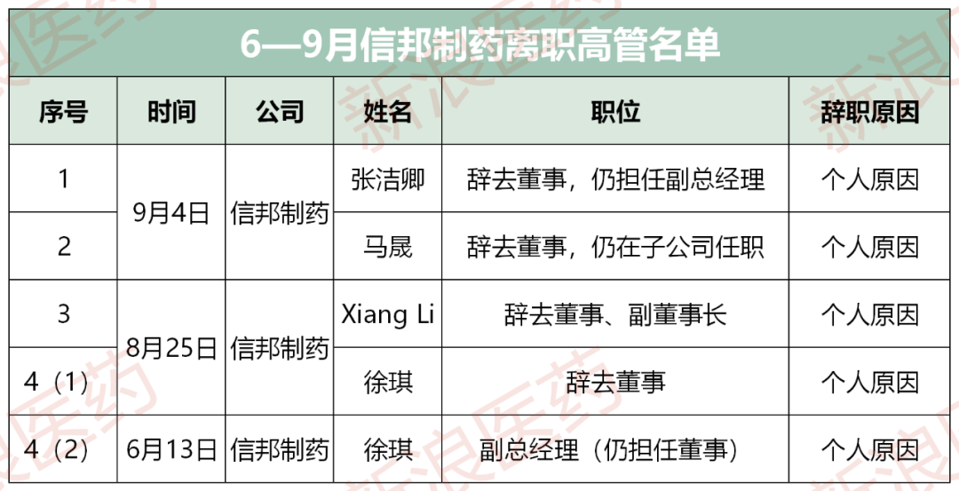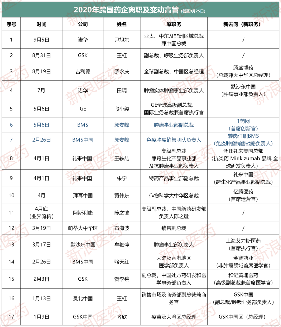 文丨haon 9月24日,三生国健发布公告称,公司副总经理倪华近日因个人原因辞去副总经理职,即日起不再担任该职务。 至此,据新浪医药不完全统计,截至今日(9月25日),2020年国内医药界已有超180位高管离职,而在即将过去的第三季度,也有52位高管离职,涉及
