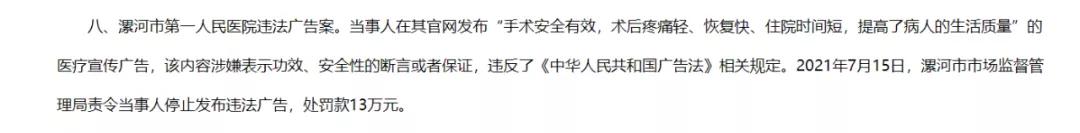 一味逐利,必然会有更多“魏则西事件”产生。 “手术安全有效,术后疼痛轻、恢复快、住院时间短,提高了病人的生活质量。” 一则公立大三甲的广告,被列为虚假广告典型。 9月22日,漯河市第一人民医院被罚13万,原因是“涉嫌表示功效、安全性的断言或者保证,