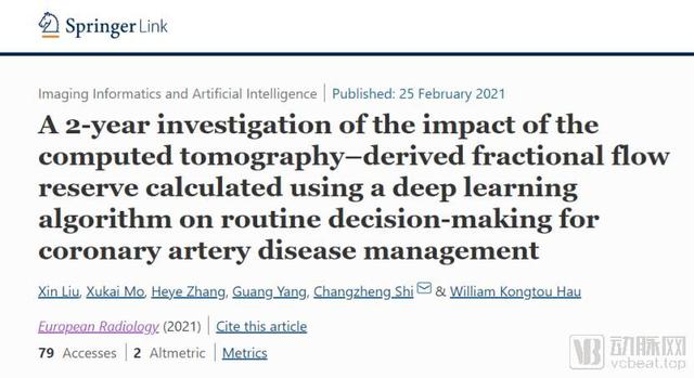 暨南大学附属第一医院史长征教授课题组在国际放射学顶级学术期刊《European Radiology》上发表了题为《A 2-year investigation of the impact of the computed tomography–derived fractional flow reserve calculated using a deep learning algorithm on r