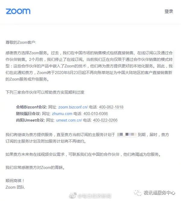 文章转载自:玄关视讯通资讯 8月3日,视频会议应用领域传来一个大消息:Zoom停止向中国大陆提供直接服务了。 关于这份停止服务的声明,详情如下: 付费用户也不能幸免。为啥不用我啊,我还没有参会方数限制! 留学圈炸锅了,学术圈沸腾了,医学领域受害颇深