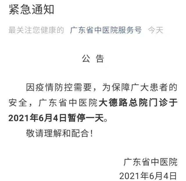 ▍来源/赛柏蓝 ▍作者/遥望 因疫情防控需要,广东多家大型医院停诊 1 广东多家大型医院停诊 佛山市禅城区人民医院 刚刚,佛山市禅城区人民医院发布”停诊通知“称,从2021年6月4日中午12时起除了保留澜石院区急诊、发热门诊和各院区住院部外,停止所有普通门