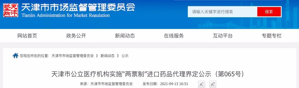 ▍来源/赛柏蓝 ▍整理/半夏 最全进口药品总代理名单汇总 近日,天津市市场建管委发布《天津市公立医疗机构实施“两票制”药品上市许可持有人界定公示(第017号)》及《天津市公立医疗机构实施“两票制”进口药品代理界定公示(第065号)》,进一步明确两票制