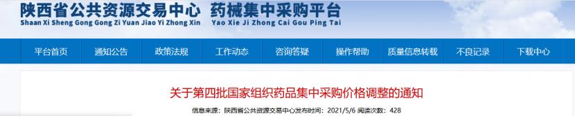 ▍来源/赛柏蓝 ▍作者/颜色 一批药品,要降价 今日(5月6日),陕西省药械集中采购网发布《陕西省关于第四批国家组织药品集中采购价格调整的通知》(以下简称《通知》)。 1 594个药品将调价 《通知》显示,中选供应陕西的60个产品(以下简称“中选产品”)按