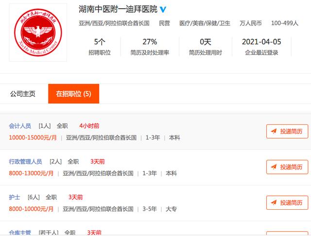 在某对外招聘网站上,湖南中医附一迪拜医院显示有多个岗位正在招聘,关于公司介绍显示,这是2012年公司结合迪拜当地中国华人需求,在迪拜建立了第一家中国人医院--湖南中医药大学第一附属医院 迪拜分院。这是第一家经迪拜卫生部审批的中国医院,现设有中医和针灸科,妇科,内科,外科,全科,皮肤科和牙科,化验,X光和B超检查和药房等。