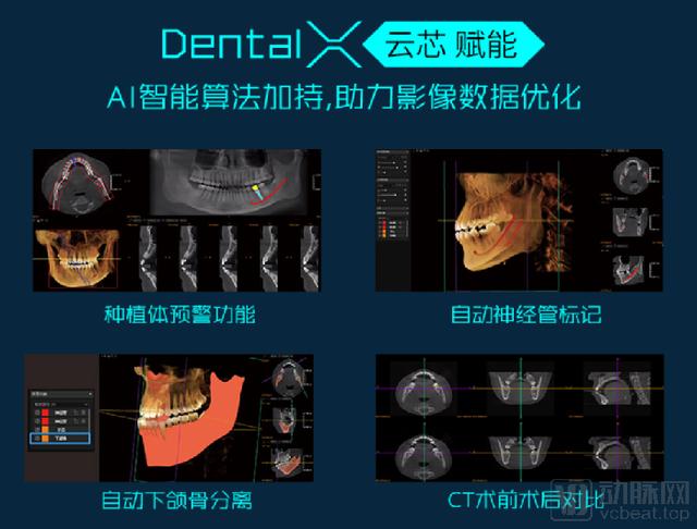 “云芯”层面,在Dental X引擎AI算法加持下,如菲森云CT除了可以获得了影像数据优化,还基于算法赋能增加了种植体预警、自动神经血管标记、自动下颌骨分离、CT术前术后对比等诸多功能。