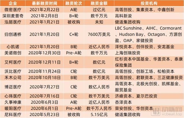 在资本方面,越来越多的投资机构、科技巨头入局医疗,投资医疗企业。在众多医疗细分领域中,神经介入如今作为“当红炸子鸡”备受关注。据动脉网不完全统计,2019年末至今,神经介入领域已有超15起融资并购事件,且沃比医疗、微密医疗等神经介入企业一年内完成2次融资,速度惊人。可以说,神经介入面临的资本环境优于曾经的冠脉支架。