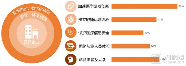 其次是利用数字化技术加速医学研发创新(43%)和优化从业者体验(41%),一方面从底层数据支持,帮助医药企业实现产品的全生命周期管理;一方面在医药行业的管理和组织架构全面拥抱数字化,帮助员工实现提高工作体验和效率的同时,提升公司效益。