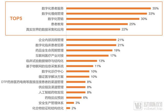 如图,在数字化技术落地的十九个细分场景中,企业布局最多的五个具体场景分别是数字化患者服务(35%)、数字化慢病管理(33%)、数字化营销(30%)、患者教育(25%)和真实世界数据的采集和应用(22%)。