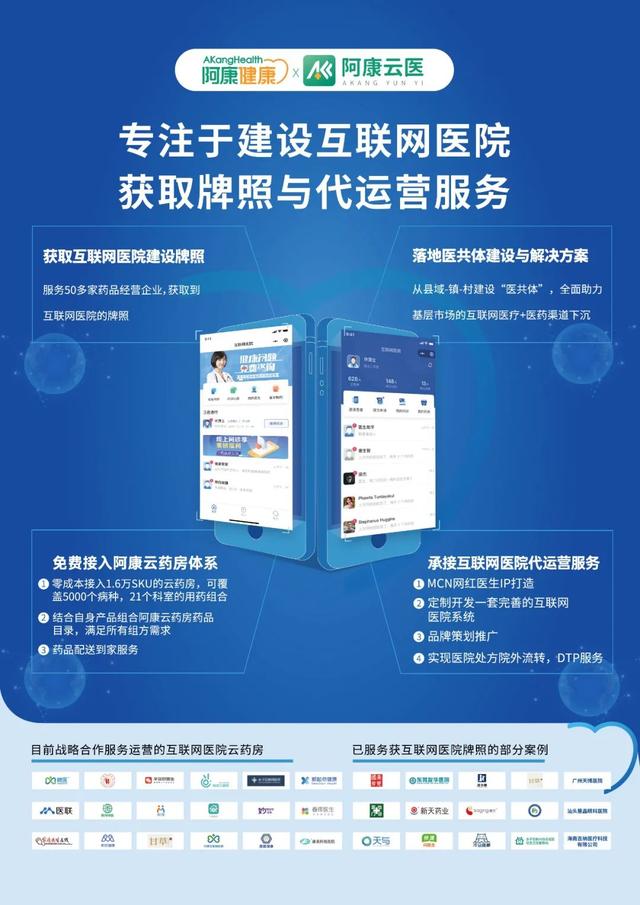 阿康互联网医院是一家专注于建设互联网医院与代运营服务,赋能大健康产业数智升维的综合性医疗平台。从【获取互联网医院牌照-组建公司-信息化系统-药品库-组建企业团队-运营策划】一站式运营支持。