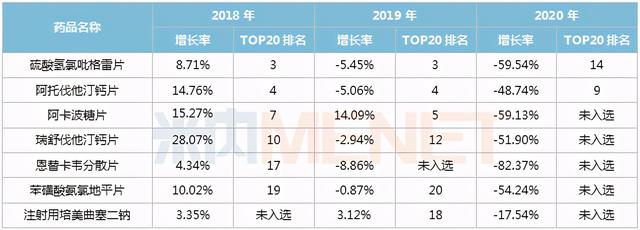 4+7集采于2019年3月陆续落地执行,11个试点城市影响有限,除了恩替卡韦分散片,其余4个品种虽增速下滑,但在2019年仍稳居TOP20,随着扩围集采于2019年底至2020年初陆续执行,2020年氯吡格雷、阿托伐他汀两个超100亿品种排名大幅下滑,其余品种退出TOP20;第二批集采于2020年4月陆续执行,2020年阿卡波糖片退出TOP20。