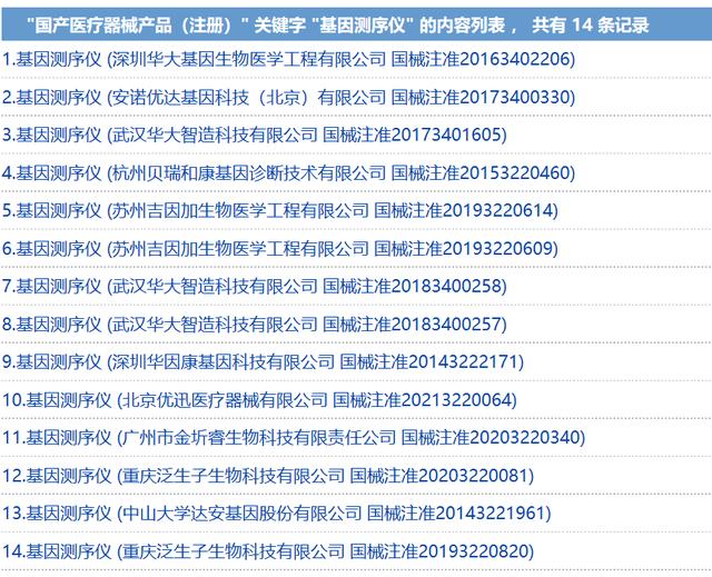 在这样强有力的政策支持下,虽然面临成本高、技术难度达、技术人员不足等困境,国内仍然有一批基因测序仪制造商逐渐崛起,并占据一定的市场份额。在我国药监局网站上查询显示,目前注册在案的国产基因测序仪共有14款,其中来自华大智造的产品最多,共有4款产品。