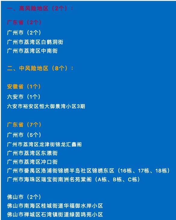 CDC疾控人的统计显示,截至2021年6月4日9时,全国31个省(自治区、直辖市)和新疆生产建设兵团共有2个高风险地区,均在广东省广州市,分别是广州市荔湾区白鹤洞街和广州市荔湾区中南街。另有8个中风险地区,安徽省1个,广东省7个。