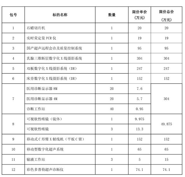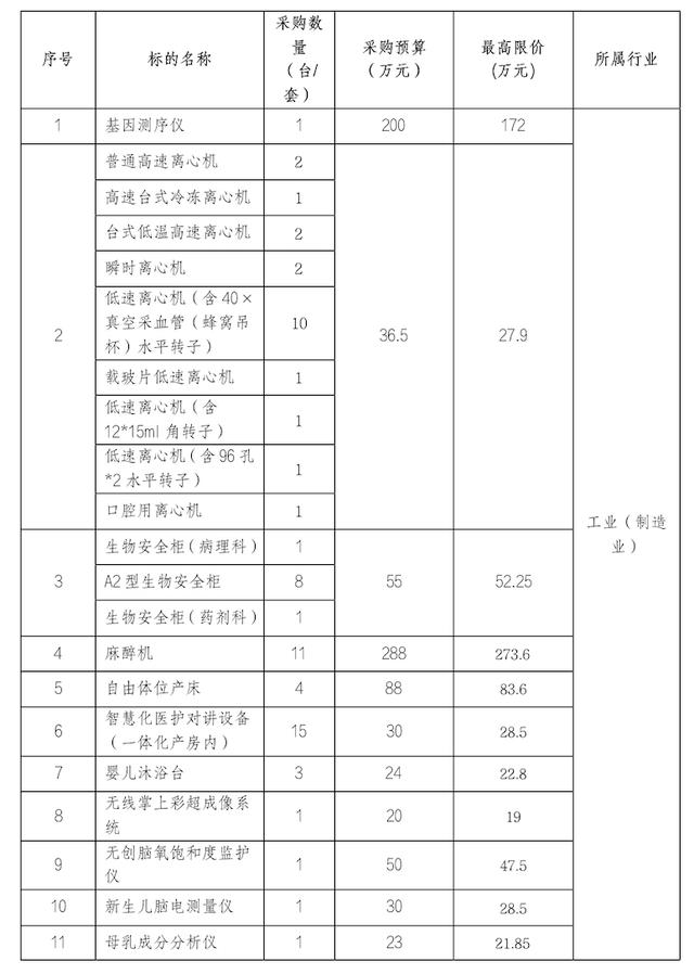 公告指出:第一批总预算52289822元,最高限价45700290元,产品包括基因测序仪、生物安全柜、麻醉剂、除颤仪等1927台/套医疗设备,共计86个分包。第二批总预算26132600元,最高限价23400950元,产品包括石蜡切片机、实时荧定量 PCR 仪、可视软性喉镜(镜体)、输液工作站等190台/套医疗设备,共计22个分包。