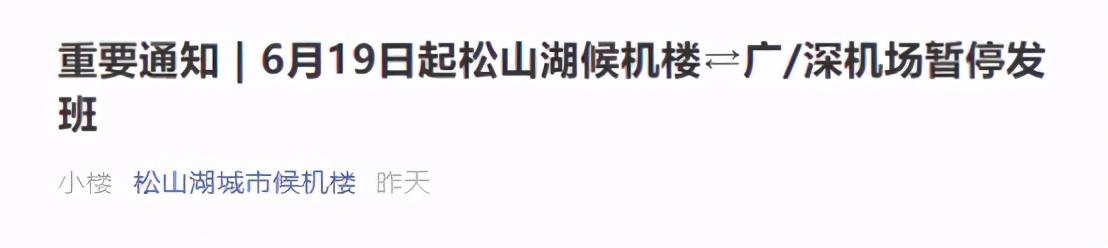同日,松山湖城市候机楼发布消息称,接上级部门最新防疫指示,因疫情防控需要:6月19日起,暂停松山湖城市候机楼⇄广州机场、松山湖城市候机楼(含各经停点)⇄深圳机场的发班,恢复之日另行通知。