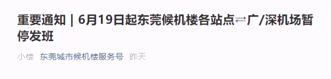 6月18日,东莞城市候机楼发布消息称,接上级部门最新防疫指示,因疫情防控需要:6月19日起,暂停东莞城市候机楼各站点⇄广州/深圳机场的发班,恢复之日另行通知。