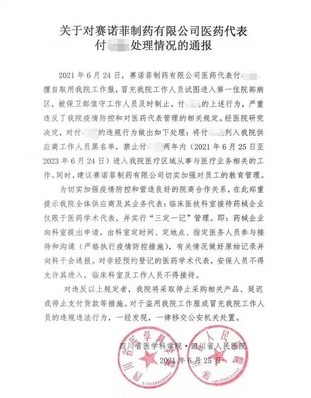 6月25日,一则《关于对赛诺菲制药有限公司医药代表付某处理情况的通报》流出,四川省人民医院、四川省医学科学院联名警告赛诺菲:建议赛诺菲制药有限公司切实加强对员工的教育管理。赛诺菲称不上“严格遵守中国的法律和相关规定”,距离“最高标准的职业道德操守”则更是遥远。