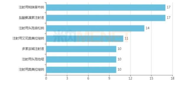 从品种过评情况来看,注射用帕瑞昔布钠、盐酸氨溴索注射液、注射用头孢曲松钠等7个品种最火,有10家及以上企业过评。除多索茶碱注射液外,其余6个注射剂品种在2020年中国公立医疗机构终端销售额均超过20亿元。