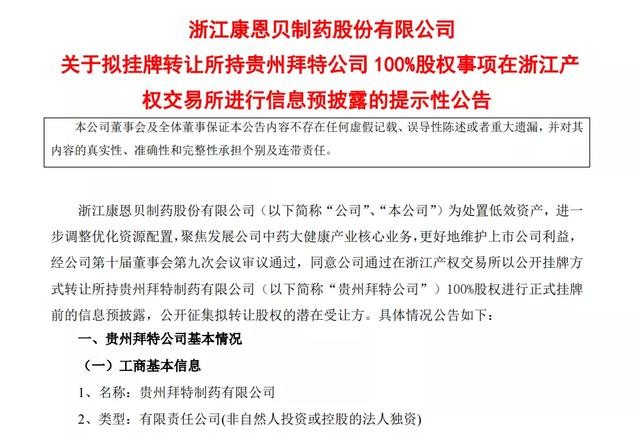 8月12日晚,康恩贝发布公告:拟转让贵州拜特100%股权,维护公司及股东利益。