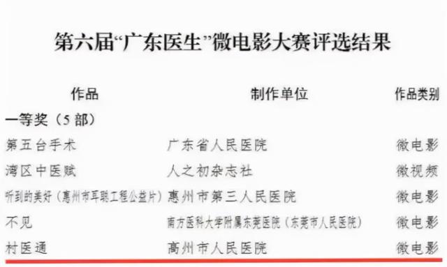 高州市人民医院甚至还组织员工,利用业余时间制作出一部微电影,名字就叫《村医通》。在今年8月第六届“广东医生”微电影大赛中,《村医通》和其他四部微电影被评为一等奖。