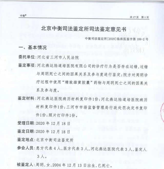 2020年12月18日,河北省三河市人民法院对 “精致雄黄胶囊”与周玥死亡之间的因果关系及参与度进行了司法鉴定。