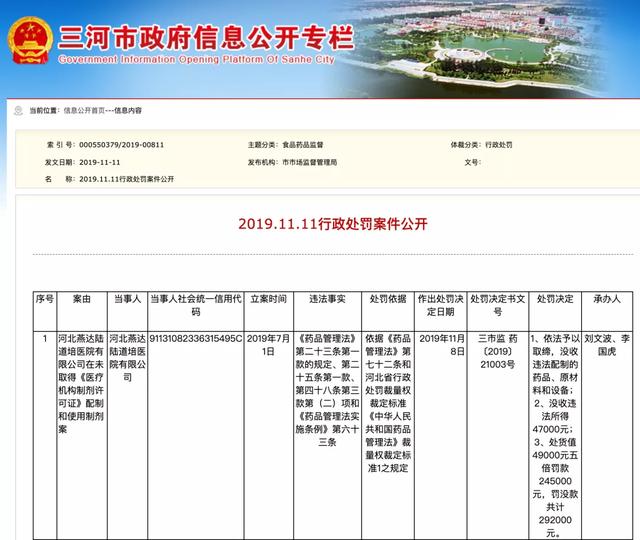 根据查认的49瓶药、每瓶1000元的价格,三河市市场监督管理局下达行政处罚决定书:“精制雄黄胶囊”按假药论处,药品、原材料和设备被没收;陆道培医院被处以29.2万元行政罚款。