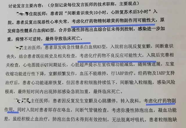 在这个14岁小姑娘的死亡病历讨论记录里,医生们讨论认为“患者反复出现恶性心率失常,考虑化疗药物精制雄黄药物副作用可能性大”、“精制雄黄药物副作用砷中毒可能性大”。