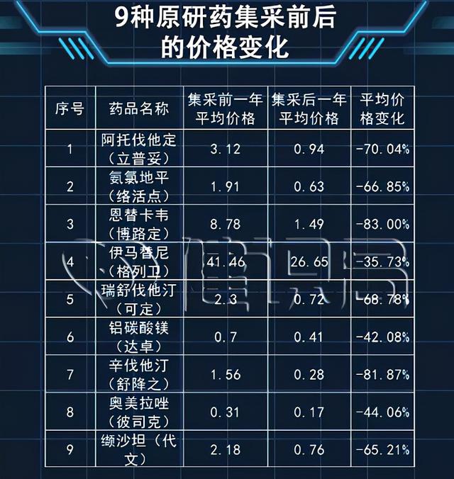 中国医疗保险研究会选取阿托伐他汀口服常释剂型、氨氯地平口服常释剂型等9种药品发现:集采前,未中选原研药的采购额是46.81亿元;集采实施后第一年,未中选原研药采购额就骤降至25.27亿元,降幅高达46.03%。