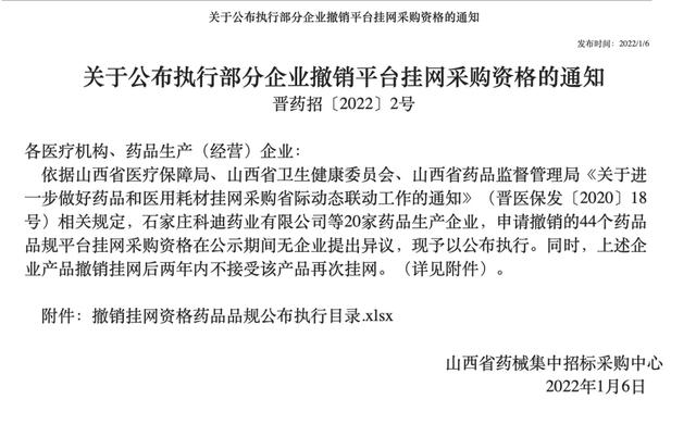 1月6日,山西省药械集中招标采购中心发布《关于公示部分企业申请撤销平台挂网采购资格的通知》, 44个药品品规申请撤网,全部是中成药。