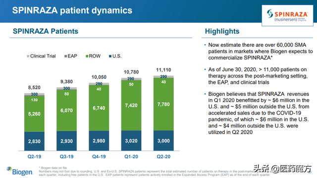 脊髓性肌萎缩症(SMA)药物Spinraza在Q2的销售额为4.95亿美元,仅小幅增长1%,上半年销售额共计10.60亿美元。从财报公布的数据来看,全球目前大约有60000例SMA患者,Spinraza覆盖人群大约有11110例。