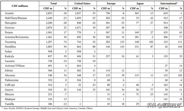 2020H1罗氏药品销售额TOP20(亿瑞士法郎)