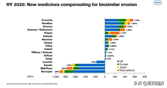 罗氏三驾马车Avastin(贝伐珠单抗)、Rituxan(利妥昔单抗)和Herceptin(曲妥珠单抗)由于受到生物类似药的影响,销售额均大幅下滑。其中,Avastin2020上半年全球销售额为28.45亿瑞士法郎,同比下滑18%,美国市场销售额巨幅下滑33%;Rituxan全球销售额为24.40亿瑞士法郎,同比下滑23%,欧洲市场下滑34%;Herceptin全球销售额22.00亿瑞士法郎,同比下滑28%,美国市场下滑42%。