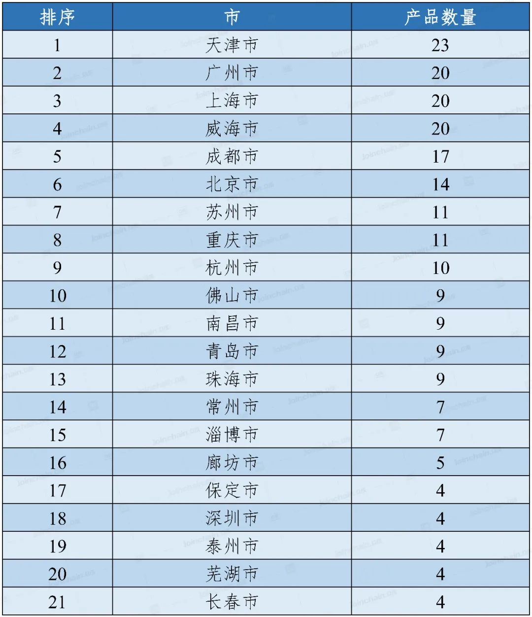 从全国各市血液净化产品数量分布看,天津市产品数量23件,全国排名第一;广州市、上海市、威海市均为20,并列排名第二。