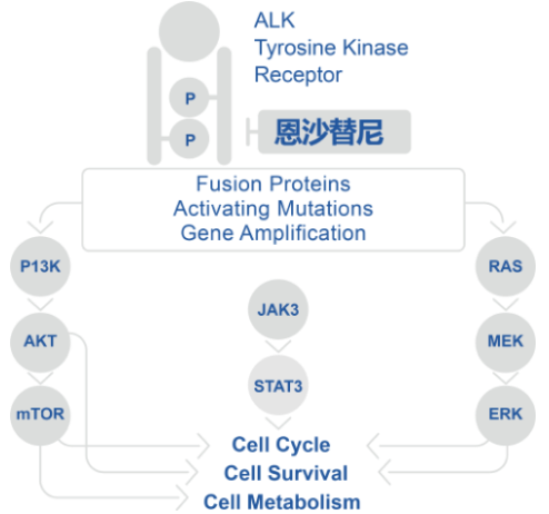 间变性淋巴瘤激酶(ALK)是NSCLC重要的致癌驱动因子之一,据统计,ALK融合蛋白基因在这部分患者中的阳性率约为5%,且多见于年轻、不吸烟或轻度吸烟的肺腺癌患者。ALK激活之后能够导致下游信号通路被激活,进而引发肿瘤的发生和存活,而ALK抑制剂能够有效抑制ALK的活性,从而起到抑制肿瘤生长的作用。而克唑替尼是第一个获得美国FDA批准针对ALK进行靶向治疗的药物,属于第一代ALK抑制剂。