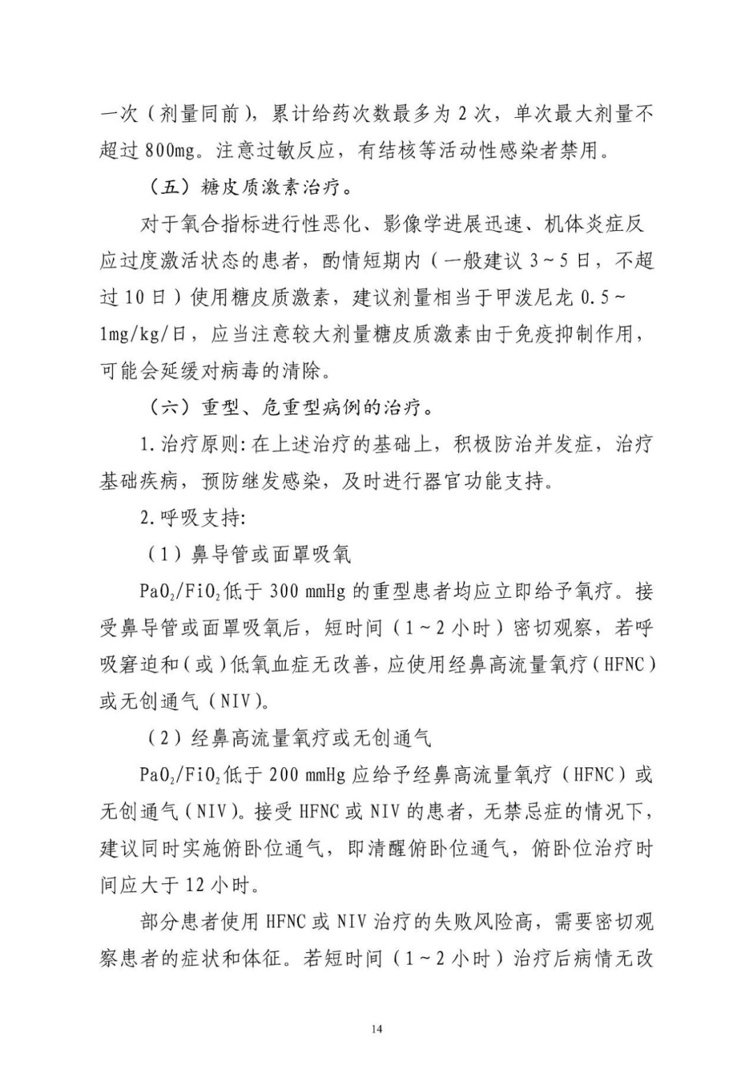 在重型、危重型病例的治疗增加了四点:1.呼吸支持:根据PaO2/FiO2分级(200~300 mmHg、150~200 mmHg和<150 mmHg)分别采取不同的呼吸支持措施,如鼻导管或面罩吸氧、高流量鼻导管氧疗或无创机械通气和有创机械通气,强调要及时评估呼吸窘迫和(或)低氧血症有无改善,如无改善,应及时更换呼吸支持措施。