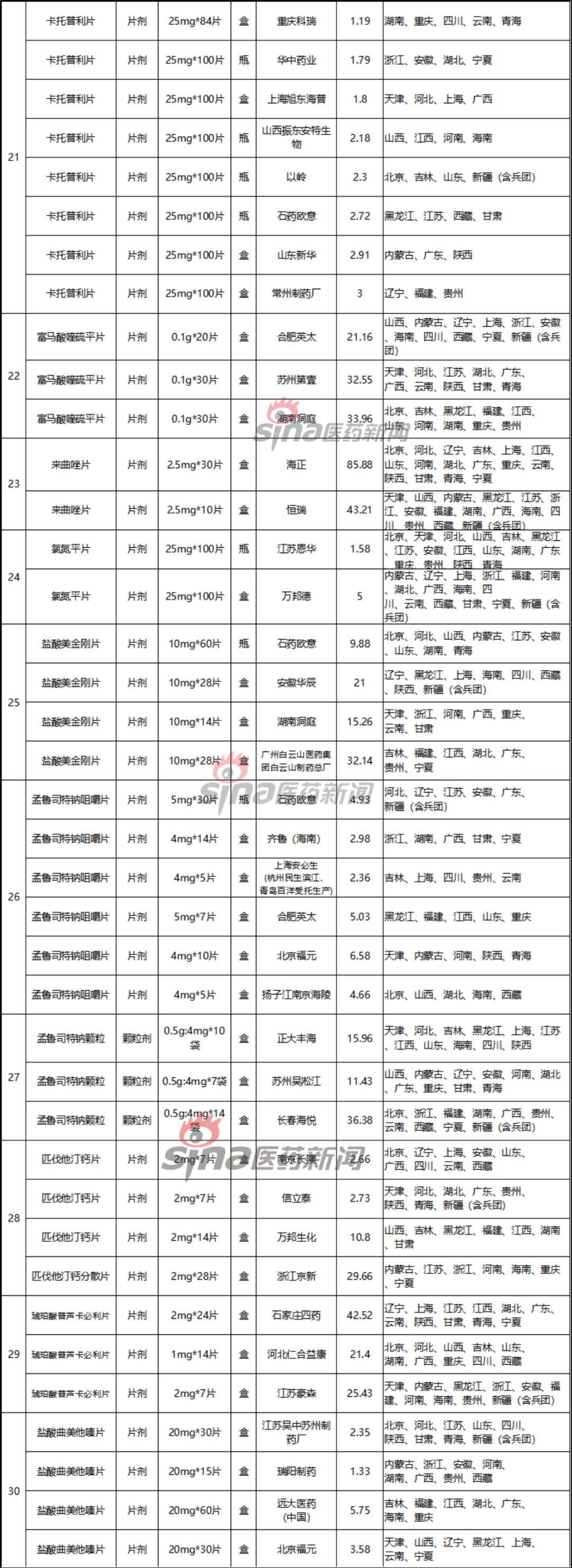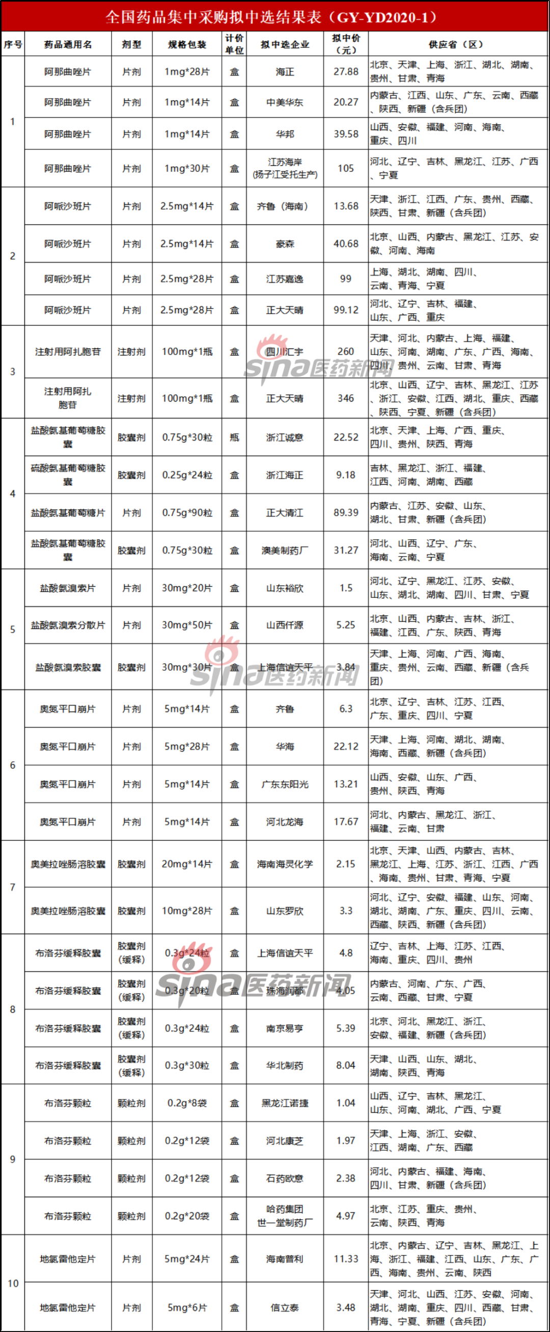 此外,恒瑞医药(非布司他片、卡培他滨片、来曲唑片、盐酸坦索罗辛缓释胶囊)、上海医药(药品盐酸二甲双胍片、盐酸氨溴索胶囊、布洛芬缓释胶囊、右佐匹克隆片、 盐酸氟西汀胶囊 及卡托普利片 )、华海药业(缬沙坦、奥氮平口崩片、盐酸舍曲林片)、信立泰(地氯雷他定、匹伐他汀、替格瑞洛片)、海正药业((硫酸氨基葡萄糖胶囊、阿那曲唑片、来曲唑片、替格瑞洛片)、科伦药业(枸橼酸托法替布片、氢溴酸西酞普兰片、盐酸达泊西汀片、阿莫西林颗粒)也纷纷中选。