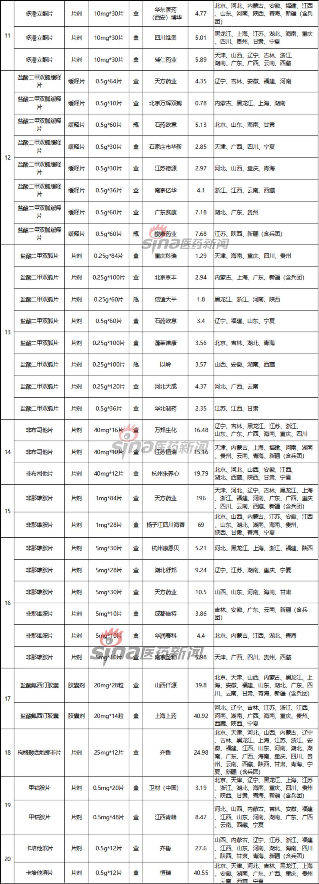 除了二甲双胍片,据不完全统计,维生素B6、卡托普利、氯氮平等品种都出现报价几分钱;氨溴索、奥美拉唑、布洛芬、多潘立酮、非那雄胺、美金刚、孟鲁司特钠、碳酸氢钠、盐酸西替利嗪、乙胺丁醇、阿莫西林等则报出一毛钱左右的价格。
