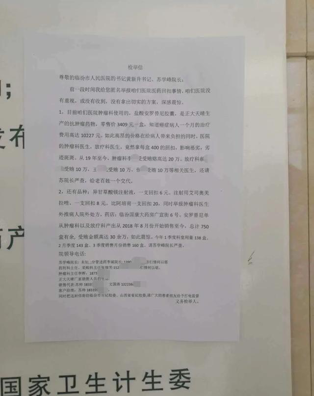 举报信显示,从2019年至今,肿瘤科某医生受贿额高达20万,放疗科超3位医生受贿10万。同时肿瘤科医生外推病人院外处方,药店为临汾国康大药房。另外,异甘草酸镁注射液、注射用艾司奥美拉唑、比阿培南,一支回扣分别为6元、8元、20元。