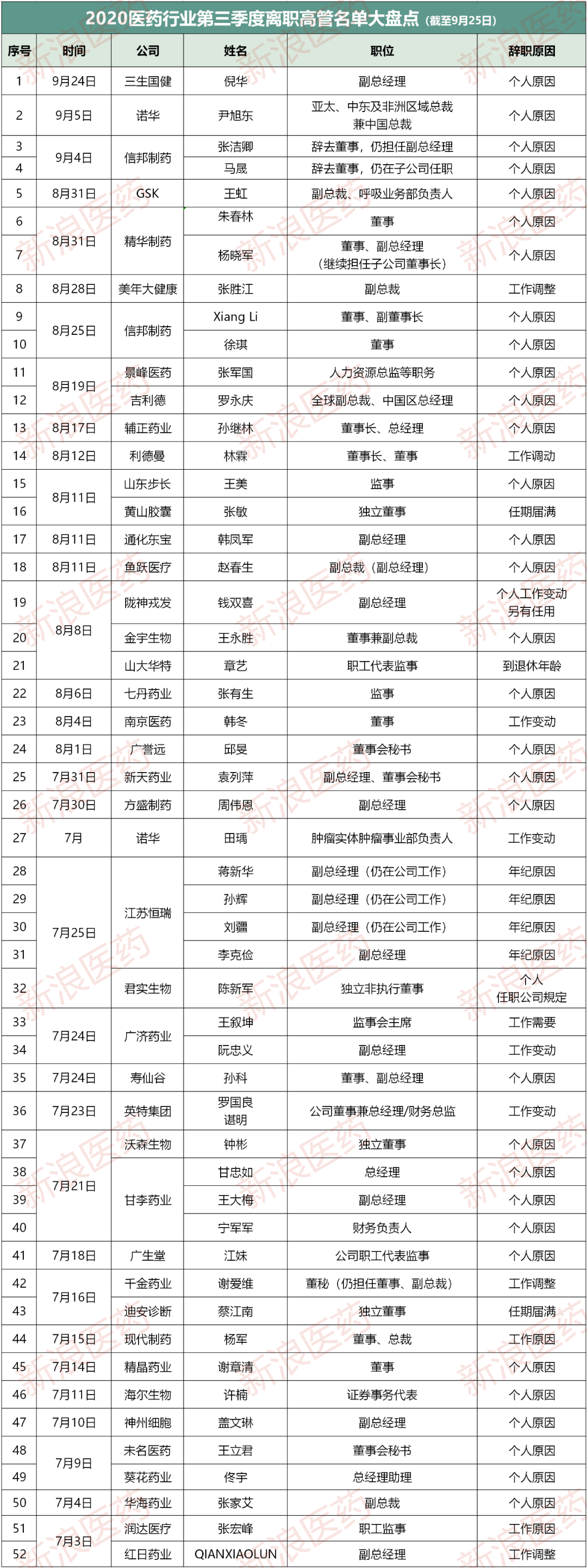 至此,据新浪医药不完全统计,截至今日(9月25日),2020年国内医药界已有超180位高管离职,而在即将过去的第三季度,也有52位高管离职,涉及诺华、GSK、吉利德等跨国巨头,也涉及恒瑞医药、山东步长等国内知名药企。