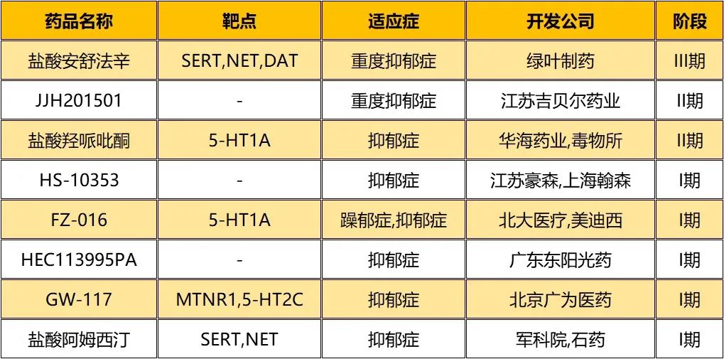 国内药企抗抑郁药物临床在研新药品种