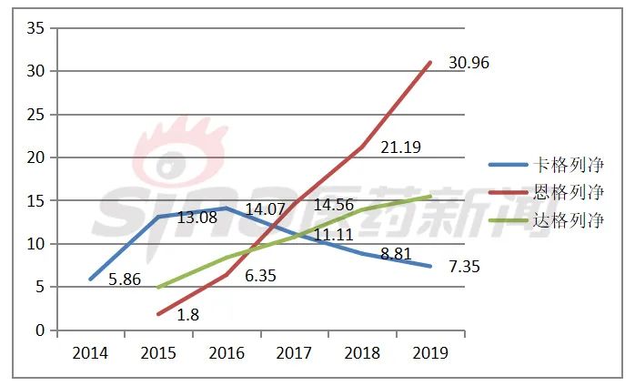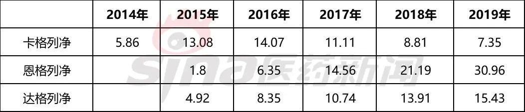 图表1 达格列净、恩格列净、卡格列净2014-2019年全球销售额(亿美元)