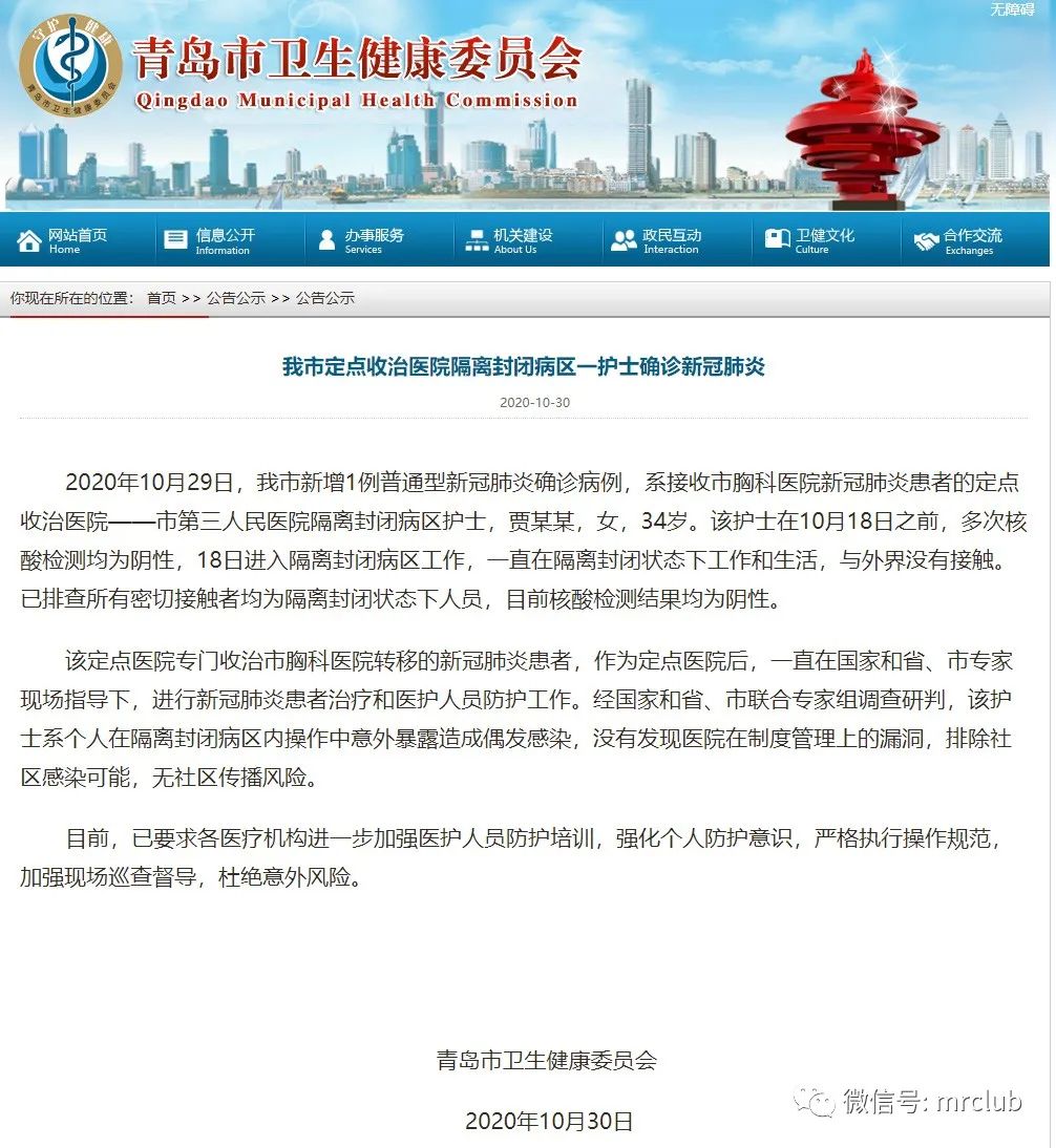 今日,据青岛市卫健委通报,2020 年 10 月 29 日,青岛市新增 1 例普通型新冠肺炎确诊病例,系接收市胸科医院新冠肺炎患者的定点收治医院——市第三人民医院隔离封闭病区护士。