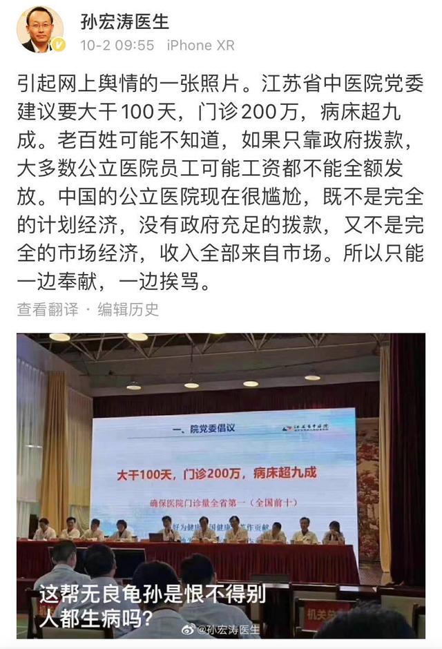 说到创收,可能会引起患者的不满,比如上个月,一家医院在内部宣讲时,喊出“大干100天,门诊200万,病床超九成”,照片流出后,引起很大争议,认为患者被当成了医院牟利的工具。