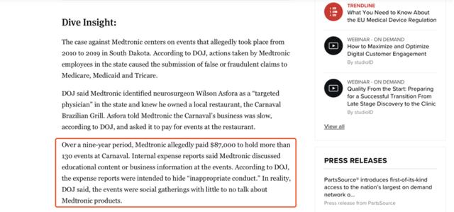 据司法部消息,他们指责美敦力(Medtronic)寻求增加其医疗器械的销售,为此支付了87000美元,在推广方面,美敦力员工还参加了130多次与餐厅有关的活动。
