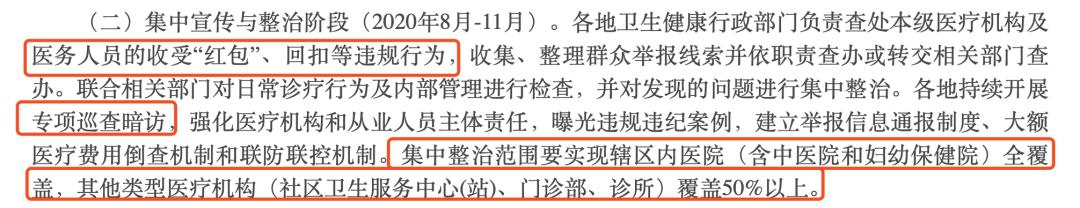 将通过暗访检查等方式,实地调查、走访、特定人约谈、抽样检测等方式,通过录音录像、电话咨询、模拟办事等手段进行整治医疗行业,有医药代表坦言,随着监管加强,公司已经在内部发函,严禁向医生给予回扣,违者开除。