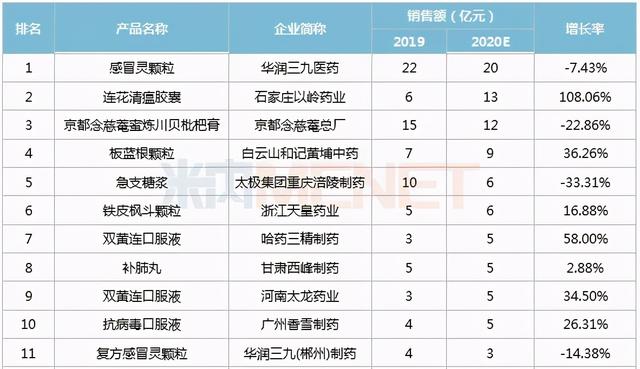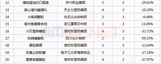 从增长率看,20个产品中有10个同比去年呈正增长,连花清瘟胶囊(感冒用药)、板蓝根颗粒(清热解毒用药)、双黄连口服液(感冒用药)、抗病毒口服液(感冒用药)、复方板蓝根颗粒(清热解毒用药)增速超过30%,其中连花清瘟胶囊大涨超100%。