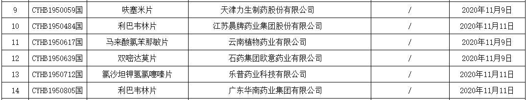 9个品种中,包括扬子江药业集团的注射用头孢西丁钠、先声药业的依达拉奉注射液、湖南科伦制药的注射用帕瑞昔布钠、天津力生制药的呋塞米片、江苏晨牌药业的利巴韦林片、云南植物药业的马来酸氯苯那敏片、石药集团欧意药业的双嘧达莫片、乐普药业的氯沙坦钾氢氯噻嗪片和广东华南药业的利巴韦林片。