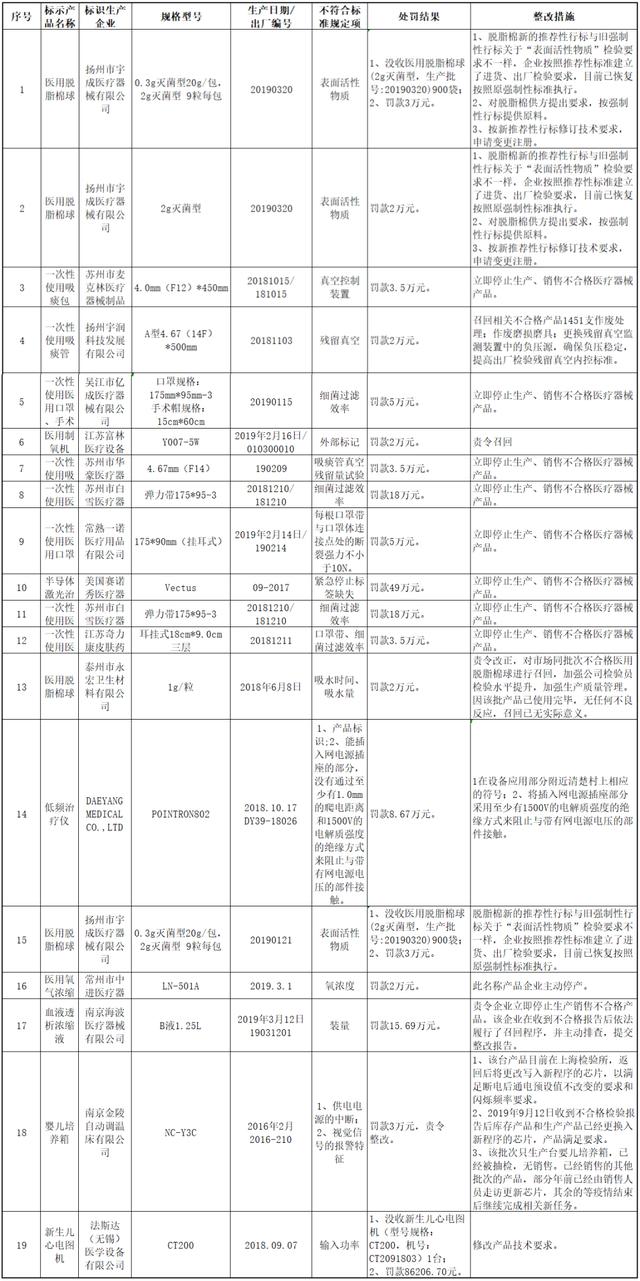 除了械企停产,近期,江苏省药监局还发布了《江苏省医疗器械国抽通告(2019年第8号)处置情况汇总表》。