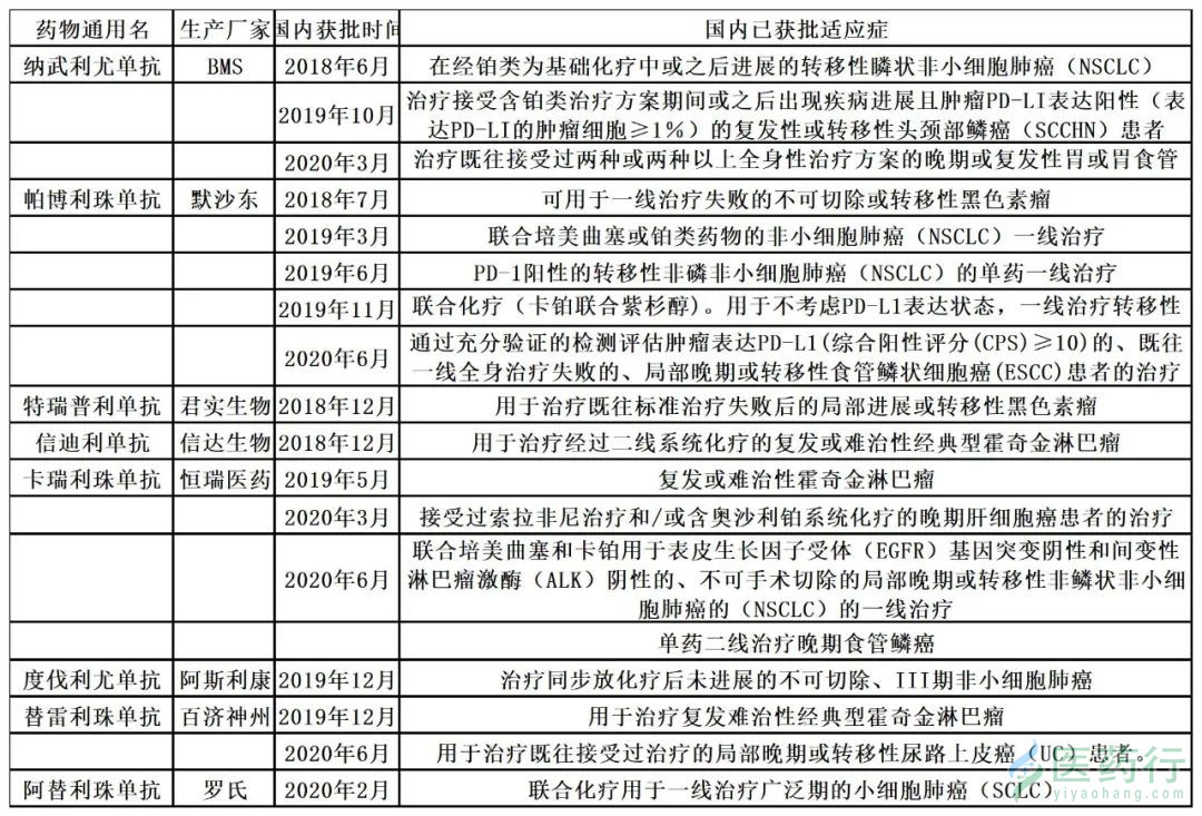 除了如下表所列的已获批新适应症,国内企业已受理的新适应症还包括了君实生物的鼻咽癌和用于治疗既往接受过系统治疗的局部进展或转移性尿路上皮癌的新适应症被受理;信达生物的一线治疗非鳞状非小细胞肺癌(nsqNSCLC)的新适应症申请;罗氏阿替利珠单抗递交联合贝伐珠单抗一线治疗肝细胞癌的上市申请等。